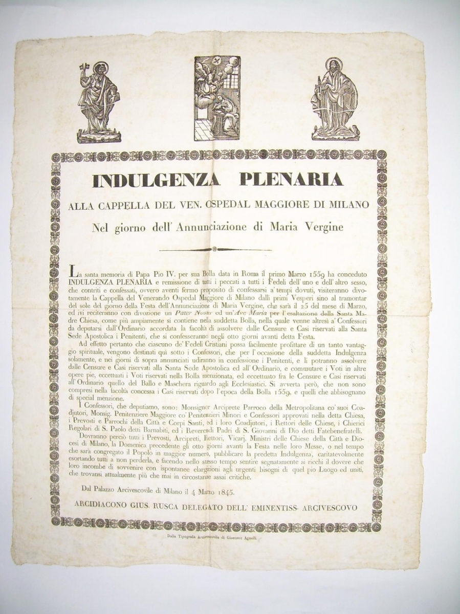 L’Archivio Storico del Policlinico di Milano conserva ben 28 documenti pontifici (bolle e brevi) e 6 episcopali, ovvero concesse da vescovi o arcivescovi. Le concessioni interessano gli ospedali precedenti alla fondazione dell’Ospedale Maggiore e in esso confluiti: del Brolo e Nuovo detto di Madonna Bona. L’Ospedale Maggiore (oggi denominato Policlinico) poi ottiene la famosa indulgenza del Perdono da Papa Pio II nel 1459, sempre rinnovata e poi resa perpetua da Papa Pio IV nel