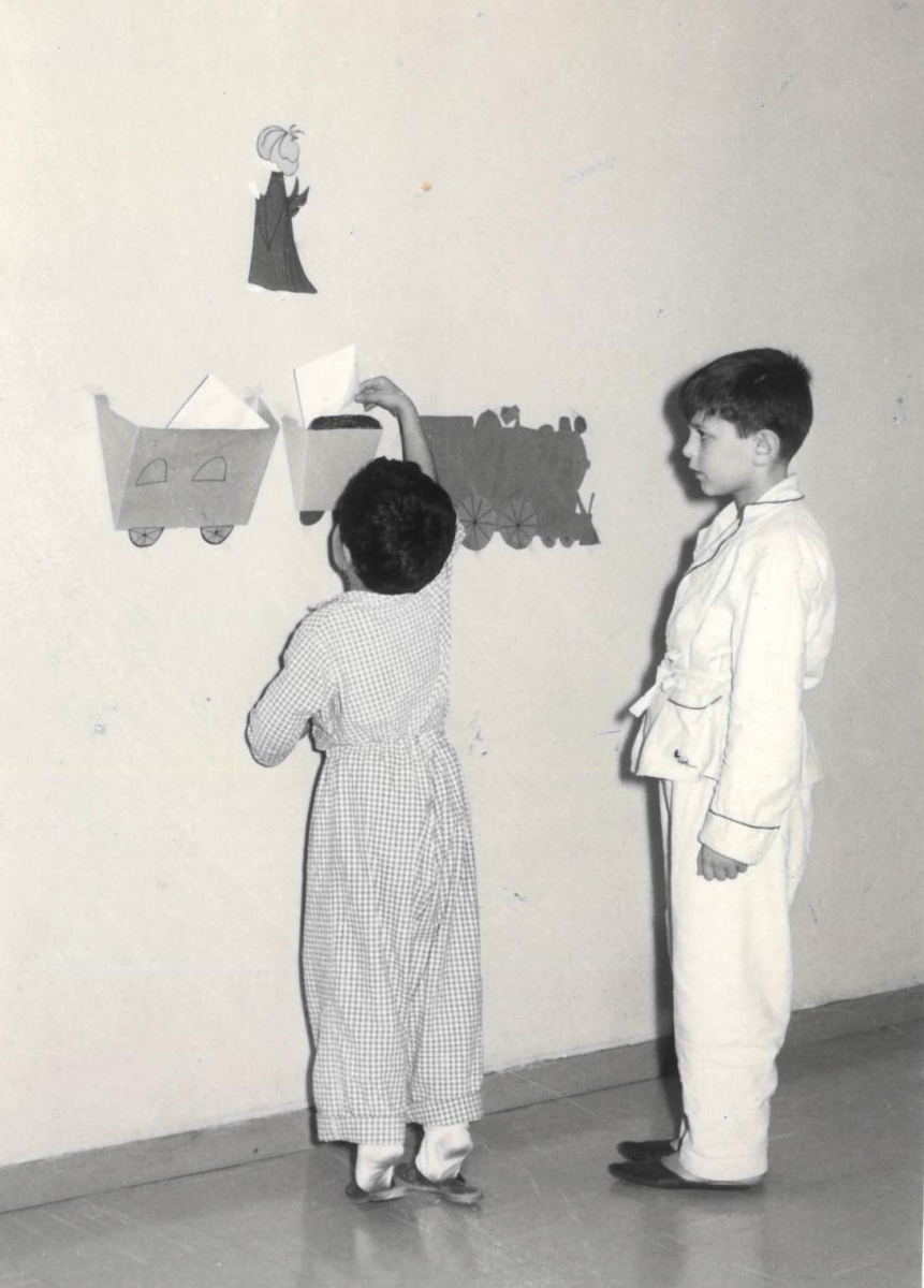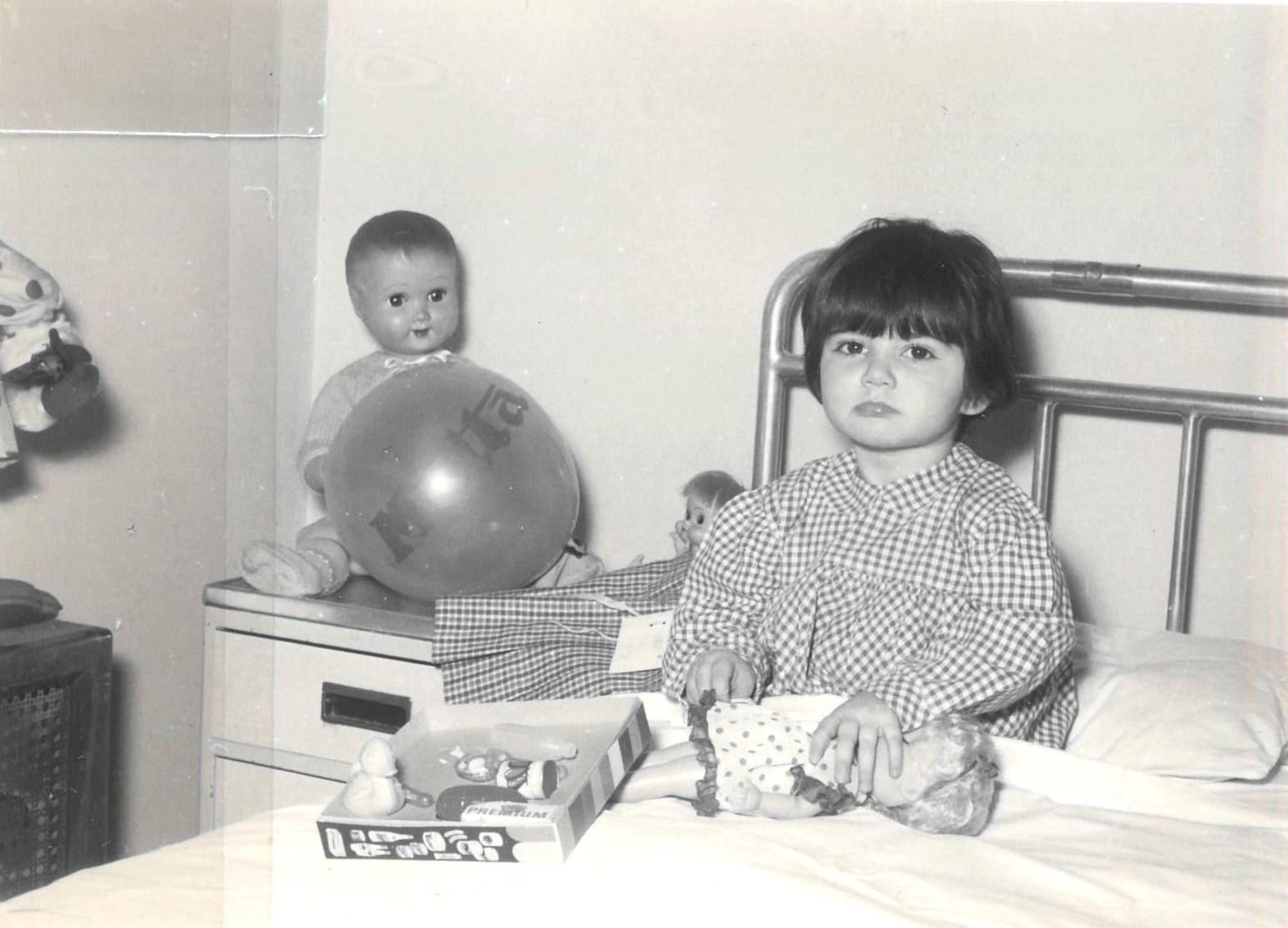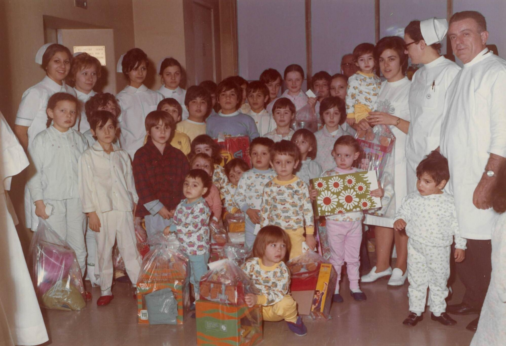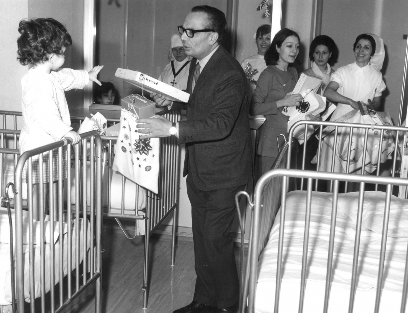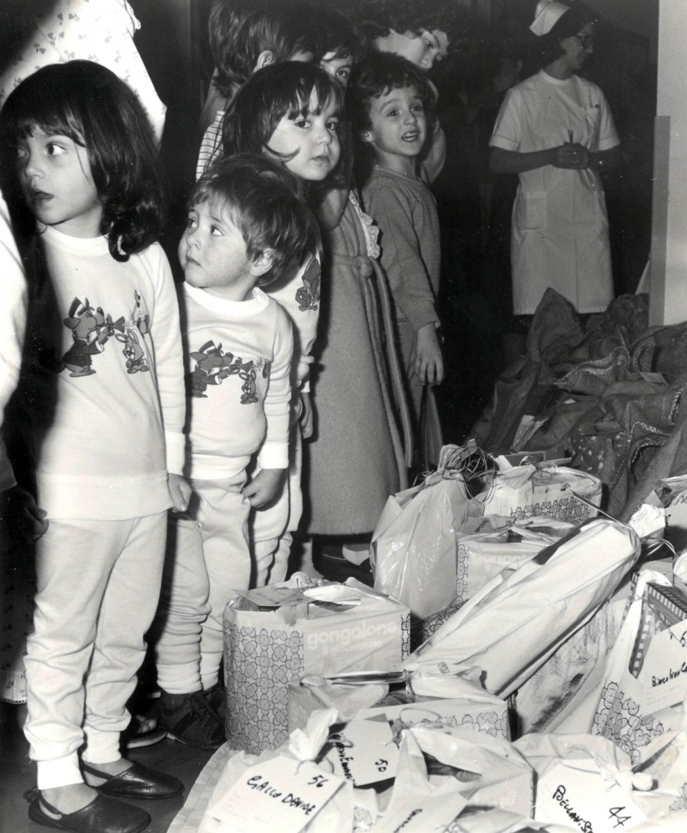 Una manina si allunga verso una bambola appena donata, un giovane Babbo Natale accompagna il Direttore del tempo visitando i piccoli ammalati e regalando giochi e biscottini, ma ci sono anche i girotondi del piccolo coro nell’oratorio di Fallavecchia o i presepi storici, che abbellivano l’esterno dei padiglioni e persino quello originale del Laboratorio istologico di Via Pace, realizzato con provette e strumenti dai dipendenti, una pratica che ancora oggi è molto sentita da alcuni team, per umanizzare i luoghi e i materiali dell’Ospedale.