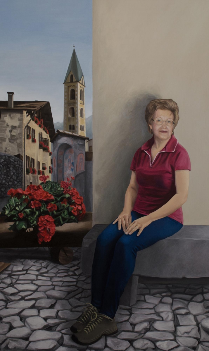 Lo sguardo dell’artista “Il mio dipinto si concentra sulla Dott.ssa Pizzi in un momento di riposo, nella cittadina di montagna che amava: Bormio e i suoi boschi intorno erano luoghi di svago a Lei cari e la benefattrice era devota a un crocefisso che è venerato proprio nella chiesa di cui raffiguro il campanile. La richiesta di questa ambientazione di sfondo mi lega a Lei e mi ha riportato alla memoria gli anni in cui in estate frequentavo anch’io quei luoghi spensierati con la famiglia”.