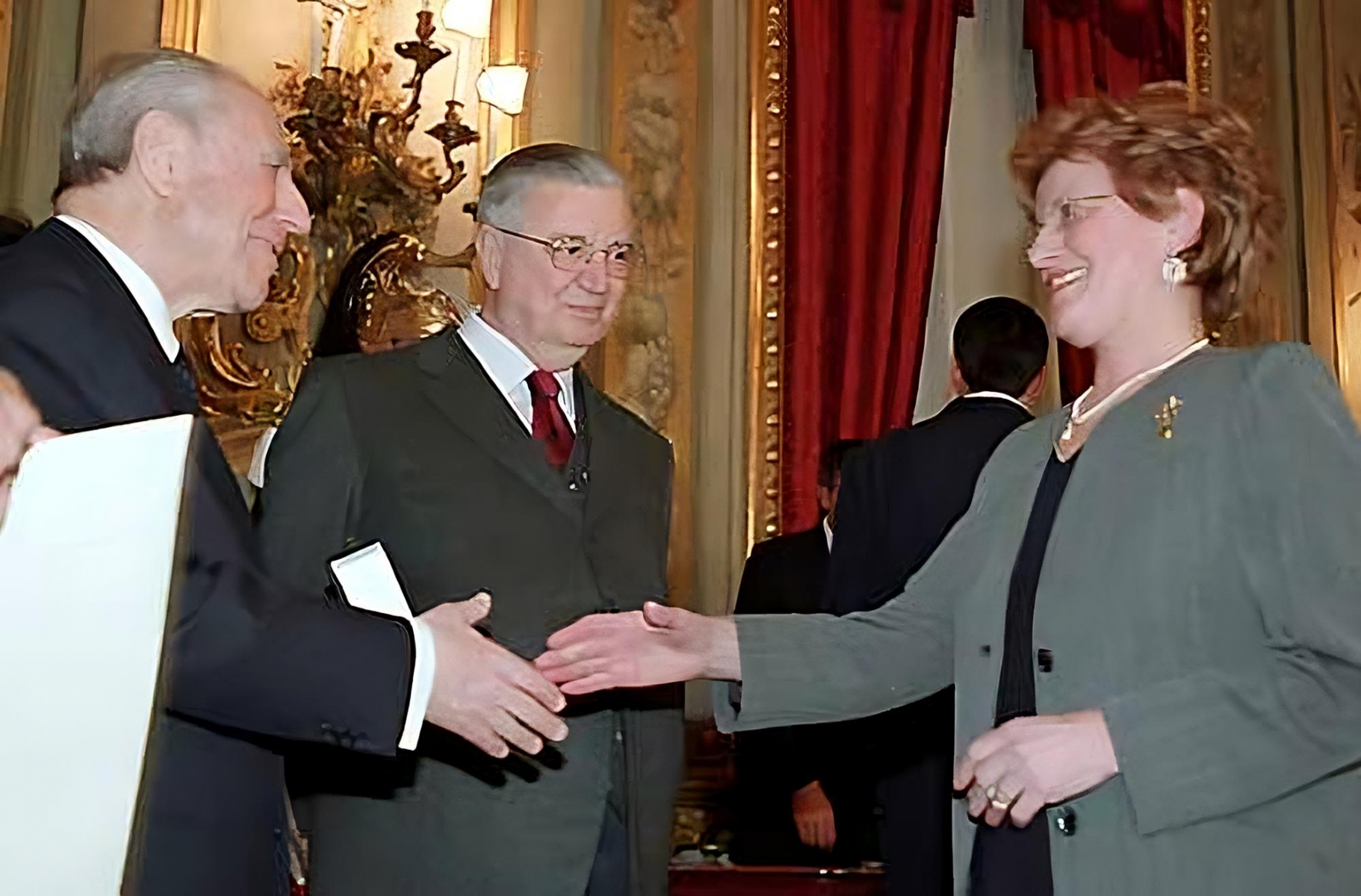 Nello scatto la stretta di mano tra Claudia Pizzi e l'allora Presidente della Repubblica Carlo Azelio Ciampi durante la cerimonia di consegna della Medaglia d’oro al merito della Sanità Pubblica nel 2003.