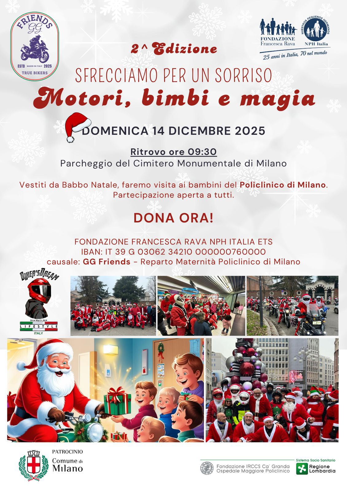 Circa cento motociclisti vestiti da Babbo Natale porteranno doni ai bambini ricoverati nei reparti De Marchi e Alfieri, regalando un momento di gioia e spensieratezza. Un modo semplice ma speciale per portare la magia del Natale anche in ospedale, illuminando la mattina dei nostri piccoli pazienti con un sorriso e un pensiero affettuoso.