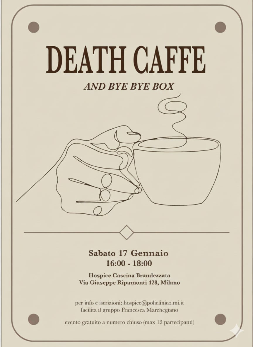Sabato 17 Gennaio l'Hospice Cascina Brandezzata del Policlinico di Milano ospiterà l'incontro "Death Café and Bye Bye Box", un momento di confronto e riflessione sui temi della morte e del fine vita, rivolto al personale sanitario e non sanitario, con l’obiettivo di promuovere ascolto, consapevolezza e benessere emotivo nel lavoro di cura.